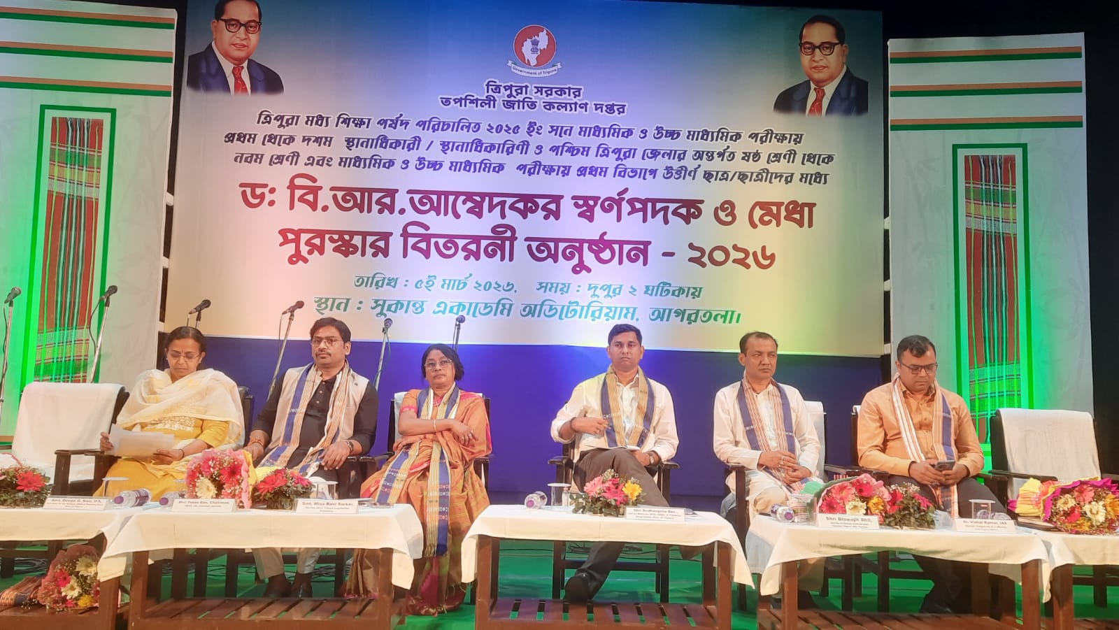 আগরতলার সুকান্ত একাডেমি অডিটোরিয়ামে ত্রিপুরা সরকারের তফসিলি জাতি কল্যাণ দপ্তরের উদ্যোগে ড. বি.আর. আম্বেদকর স্বর্ণপদক ও মেধা পুরস্কার বিতরণী অনুষ্ঠান–২০২৬ অনুষ্ঠিত হয়। মাধ্যমিক ও উচ্চ মাধ্যমিক পরীক্ষায় কৃতিত্ব অর্জনকারী তফসিলি জাতিভুক্ত ছাত্রছাত্রীদের এদিন সম্মানিত করা হয়। অনুষ্ঠানে উপস্থিত ছিলেন রাজ্যের বিভিন্ন দপ্তরের বিশিষ্ট অতিথি ও কর্মকর্তারা।