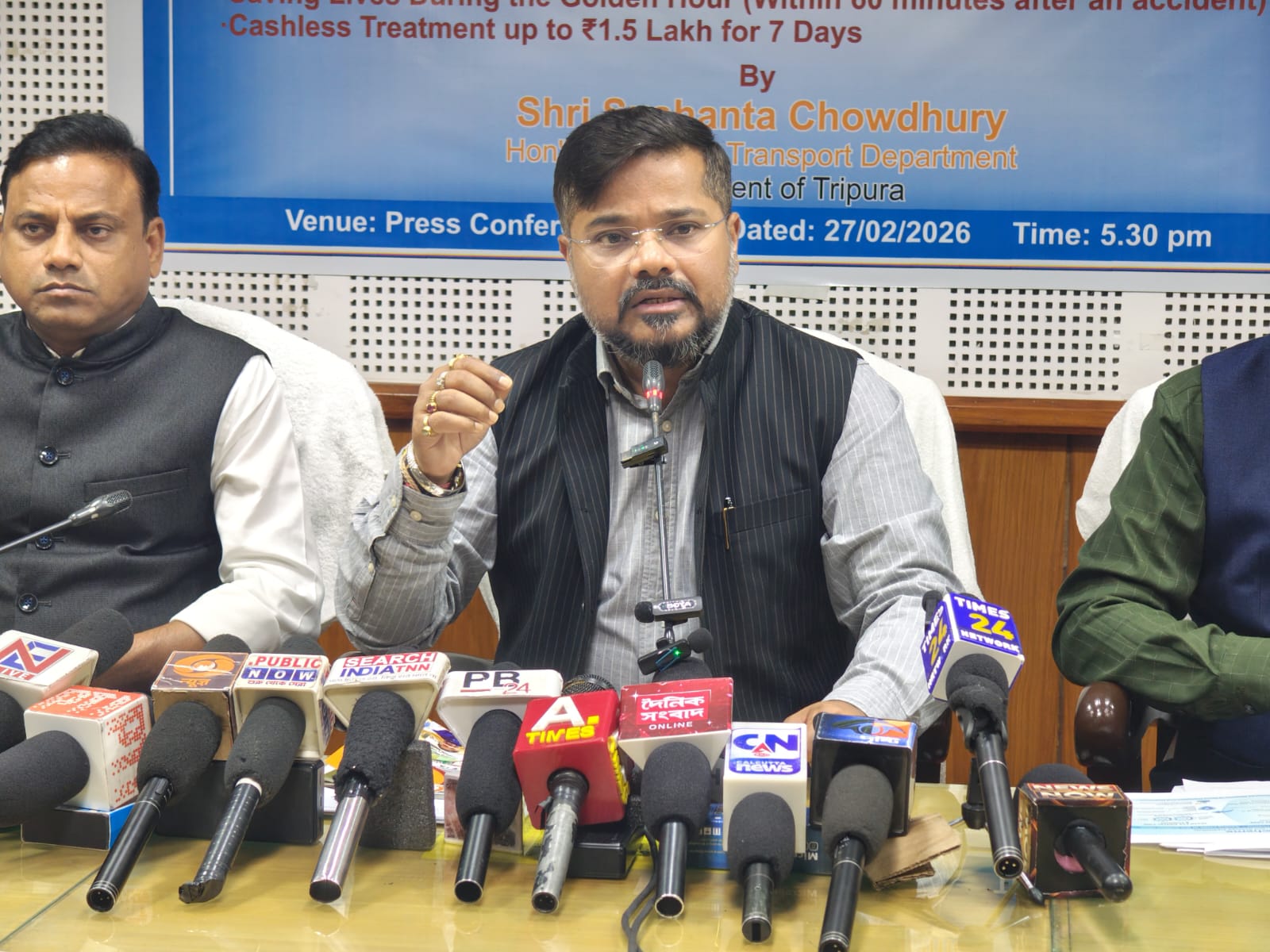 পি এম রাহাত স্কীমে বড় স্বস্তি সড়ক দুর্ঘটনায় আহতদের জন্য। ত্রিপুরা জুড়ে ১৪১টি হাসপাতালে মিলবে ৭ দিন সম্পূর্ণ বিনামূল্যে চিকিৎসা, সর্বোচ্চ দেড় লক্ষ টাকা পর্যন্ত খরচ বহন করবে কেন্দ্রীয় প্রকল্প। মহাকরণে আনুষ্ঠানিক ঘোষণা করলেন রাজ্যের পরিবহন দপ্তরের মন্ত্রী সুশান্ত চৌধুরী।