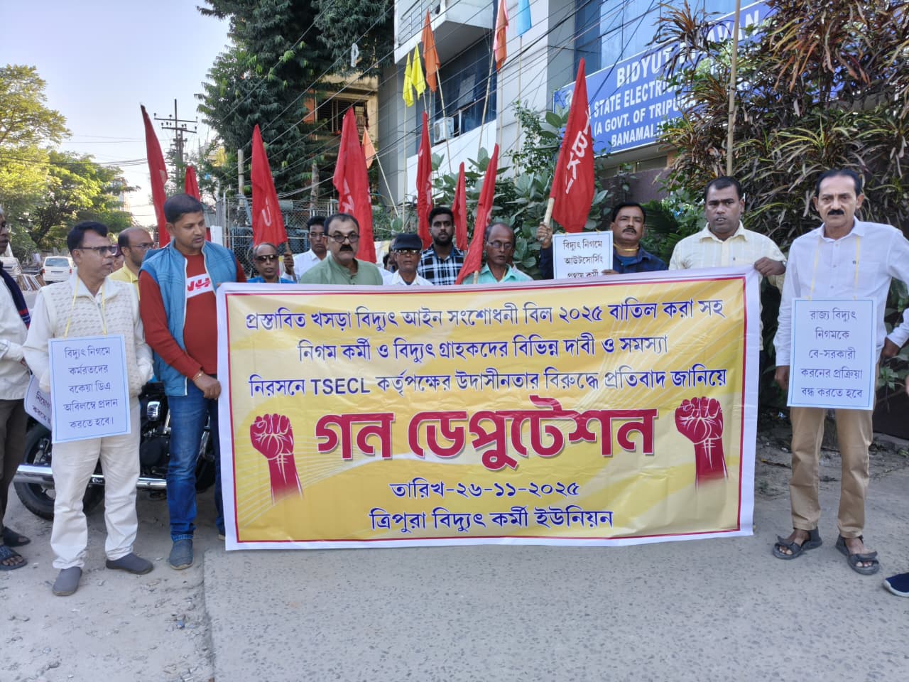 প্রস্তাবিত খসড়া বিদ্যুৎ আইন সংশোধনী বিল ২০২৫ বাতিলের দাবিতে, বিদ্যুৎ নিগম কর্মী ও বিদ্যুৎ গ্রাহকদের নানান সমস্যা সমাধানের আহ্বান জানিয়ে ত্রিপুরা বিদ্যুৎ কর্মী ইউনিয়নের উদ্যোগে আজ অনুষ্ঠিত হলো গণ ডেপুটেশন কর্মসূচি। TSECL কর্তৃপক্ষের উদাসীনতা, অনিয়ম এবং জনস্বার্থবিরোধী সিদ্ধান্তের বিরুদ্ধে ক্ষোভ প্রকাশ করে জেলা বিদ্যুৎ ভবন চত্বরেই কর্মীরা জোরালো প্রতিবাদ জানান। সরকারের কাছে অবিলম্বে প্রয়োজনীয় পদক্ষেপ গ্রহণ ও সাধারণ মানুষের স্বার্থ সুরক্ষার দাবি তোলে আন্দোলনকারীরা।