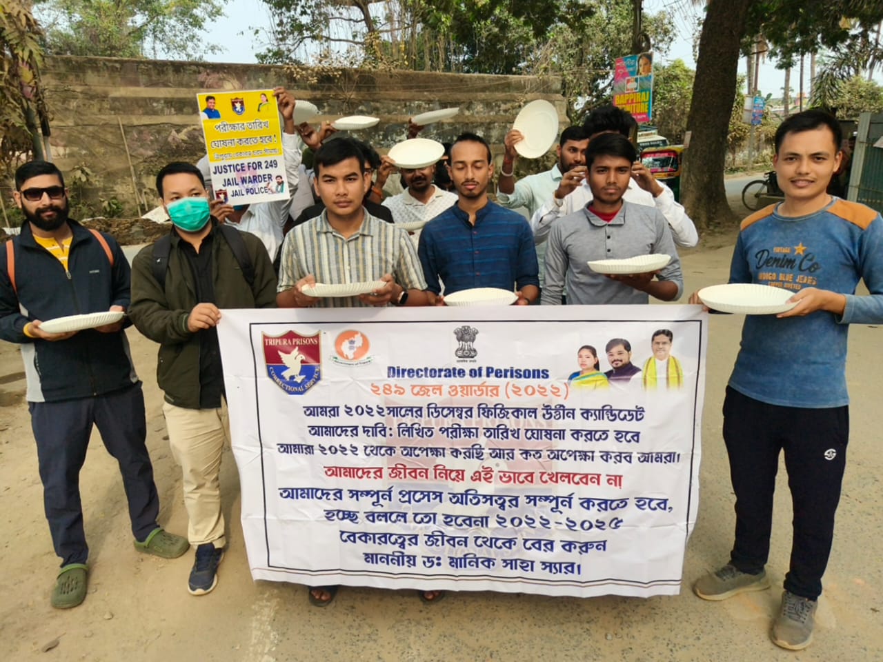 ২৪৯টি কারা রক্ষী পদের নিয়োগ প্রক্রিয়া দ্রুত শুরু করার দাবিতে আগরতলায় অবস্থান বিক্ষোভ কর্মপ্রার্থীদের। হাতে থালা ও স্লোগানে মুখর প্রতিবাদকারীরা বলেন, প্রশাসনের বিলম্বে তাদের ভবিষ্যৎ অনিশ্চয়তার মুখে ঠেলে দেওয়া হচ্ছে।
